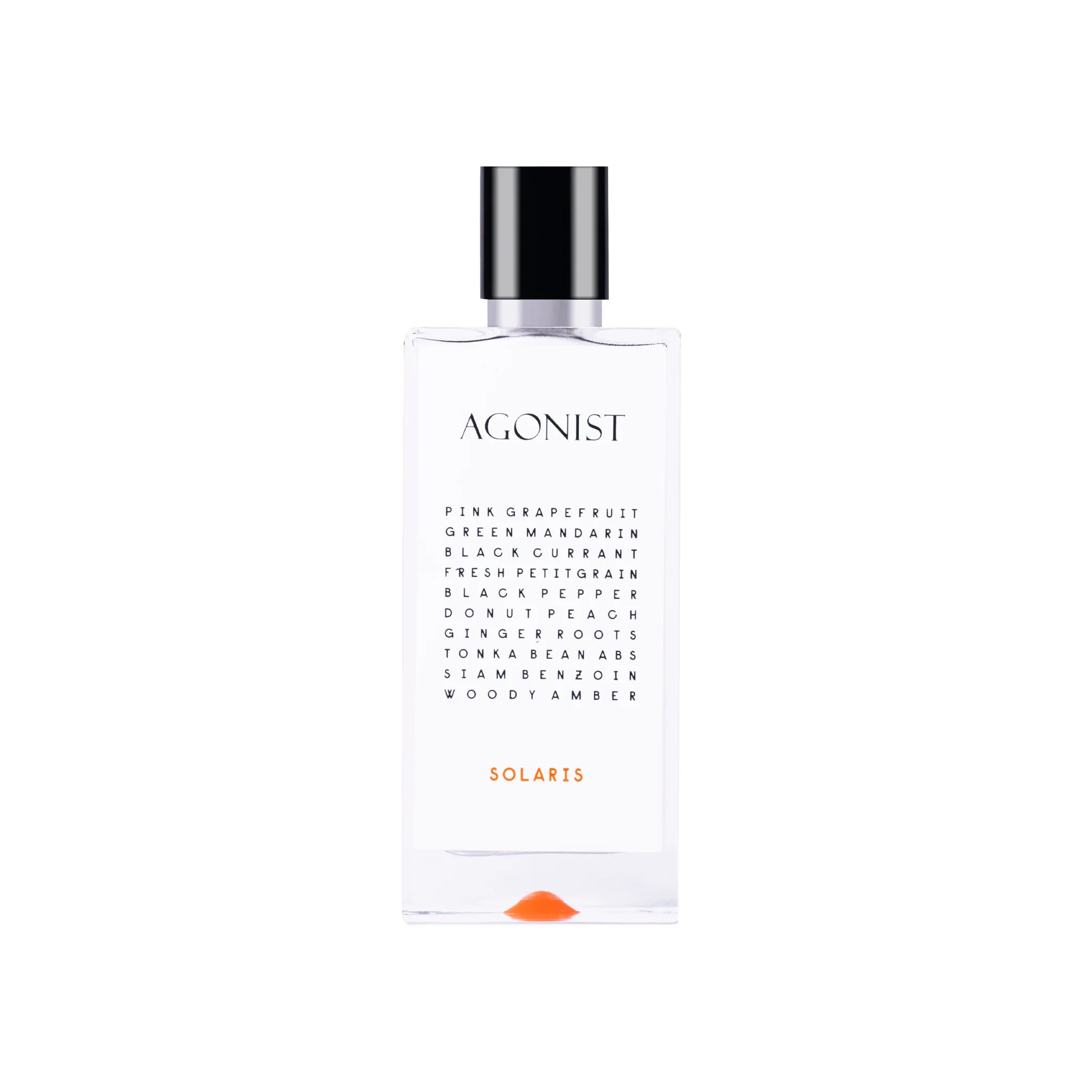 Agonist — Solaris is a radiant citrus-aromatic that captures sun-struck horizons and sparkling sea air. It opens in a burst of light—juicy tangerine and pink grapefruit with black currant bite, bright lemon, and a green shimmer of petitgrain. The heart turns breezy and playful: velvety peach drifts over crisp marine nuances, while galbanum, ginger, and black pepper add fresh, aromatic lift. As it settles, warmth gathers—ambered resins and tonka glow over earthy patchouli and a saline touch of ambergris—leaving a luminous, feel-good trail.